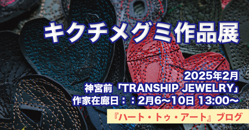 展示は2月中行われているようですが、キクチさんの在廊日は「2月6〜10日 13:00〜」とのことです。お気をつけください。また展示内容も不明ですが、たくさんのハートをモチーフとしたレザーアイテムが展示されていると思われます。昨年の展示の際に「いっぱい作っている」と話されていましたので。