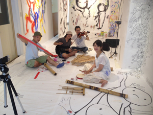 まずは即興音楽を楽しむ「まんまる森の音楽団?」の結成! ぴえーるママさんのヴァイオリン、高橋輝雄さんのガムテープ、kuroさんのギター、kisaiさんの太鼓などの演奏大会。それぞれが「自分のポイントで音を鳴らす→爆笑」の繰り返し。音遊びの無限ループがしばらく続きました。最後はポーズをキメてもらって一枚!